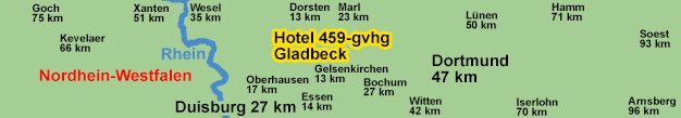 Oberhausen 17 km, Bochum 27 km, Duisburg 27 km, Dortmund 47 km und Düsseldorf 53 km.